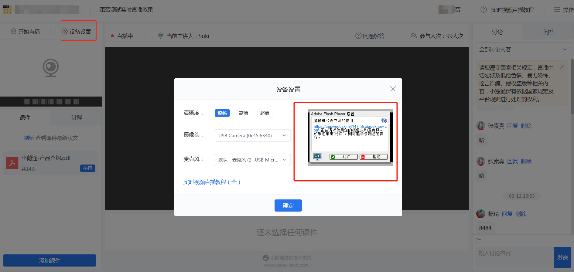 1. pc网页端实时视频直播,讲师进入直播间后,在【设备设置】处需要点击允许flash运行,如需单独对摄像头或者麦克风设备进行调整,可以对【设置】处点击右键,会出现单独设置的页面,麦克风设置页可以选择需要使用的麦克风,【降低回音】达到降噪的效果,摄像机设置页可以选择需要使用的摄像头,具体参考以下截图: