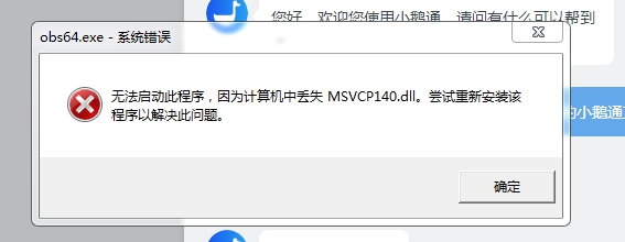 2. Windows安装小鹅通直播助手完毕后,双击应用程序启动,提示“无法启动此程序,因为计算机中丢失MSVCP140.dll。尝试重新安装该程序以解决此问题”或其他类型错误提示,例如:
